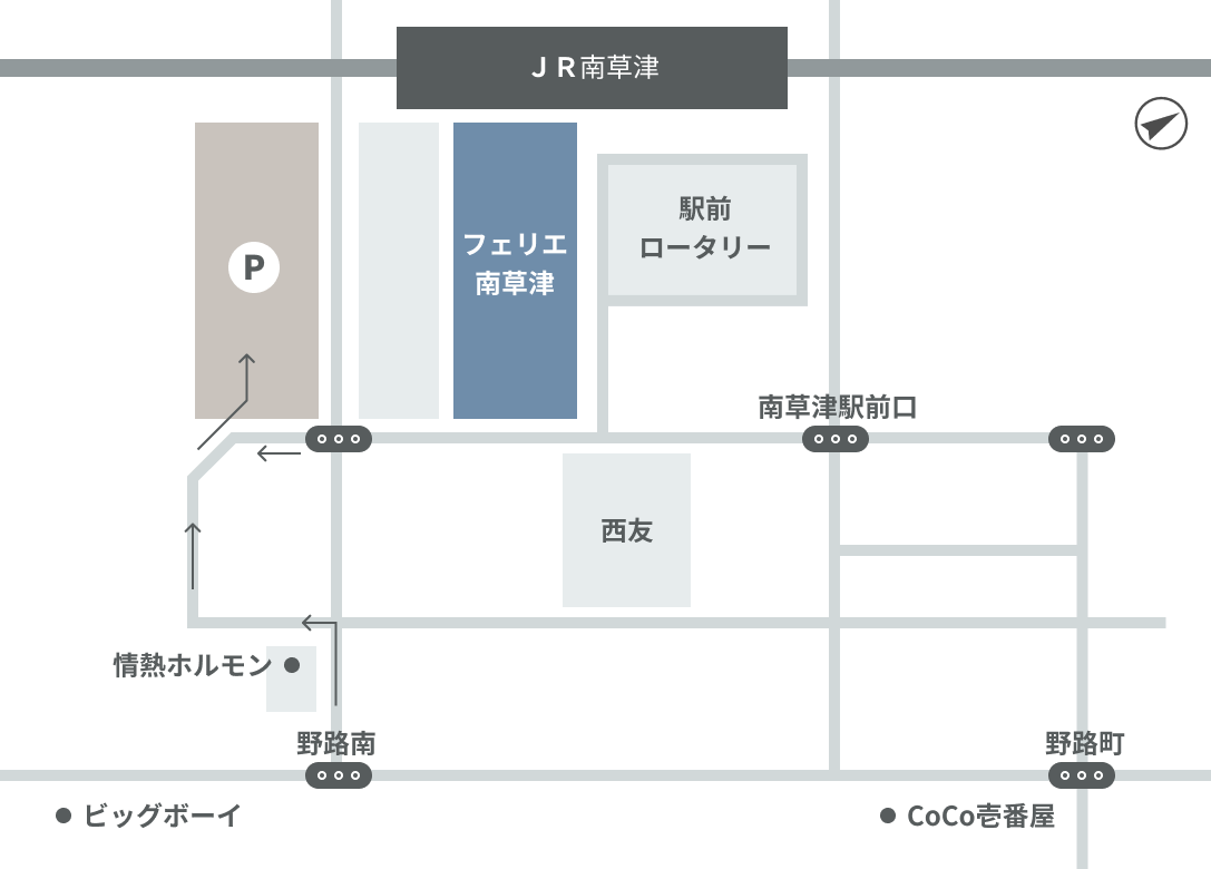 当クリニックがあるFeriE(フェリエ)南草津はJR南草津駅と直結しているので迷うことなく簡単にご来院いただけます。