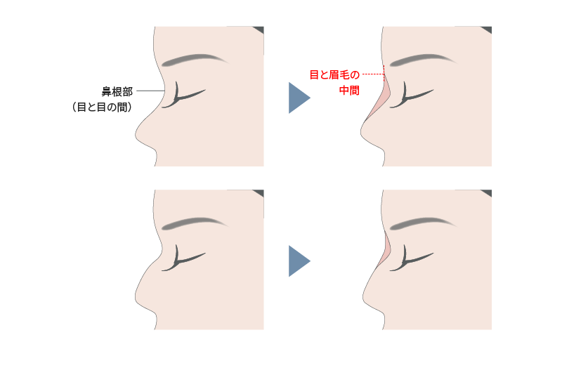 たとえば鼻筋を通したい場合、鼻根部(目と目の間)から鼻先までの真っ直ぐなラインを描き、足りない部分を埋めるよう注入します。また、鷲鼻を改善したい場合は、盛り上がりの上方に注入し、段差をなめらかにし、まっすぐな鼻筋を作ります。