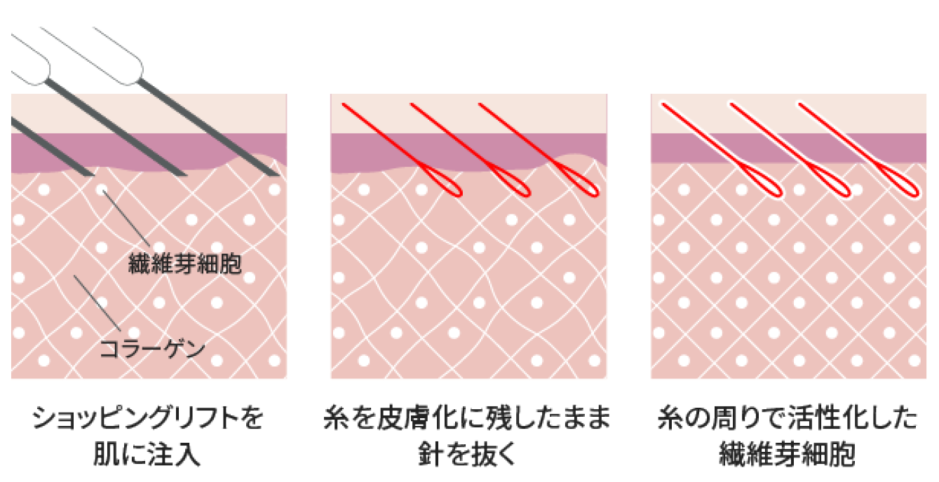 ショッピングリフトは、細い医療用の鍼を使って皮膚の浅い層に糸を挿入し、鍼を抜いた後に糸が皮下に残ることで、肌の引き締めやハリ感の向上が期待できる施術です。
