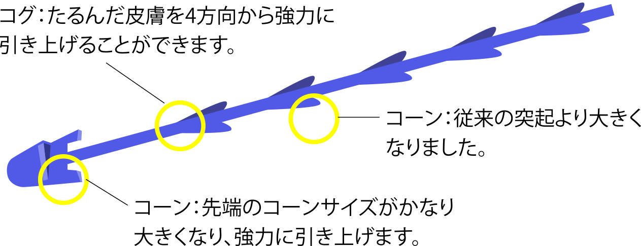 糸にしっかりとしたコグ(突起)がついており、皮下組織を強力に捉えることで高いリフトアップ効果が期待できる施術です。特に「フェイスラインのもたつき」「ほうれい線」「中顔面のたるみ」が気になる方に適しています。