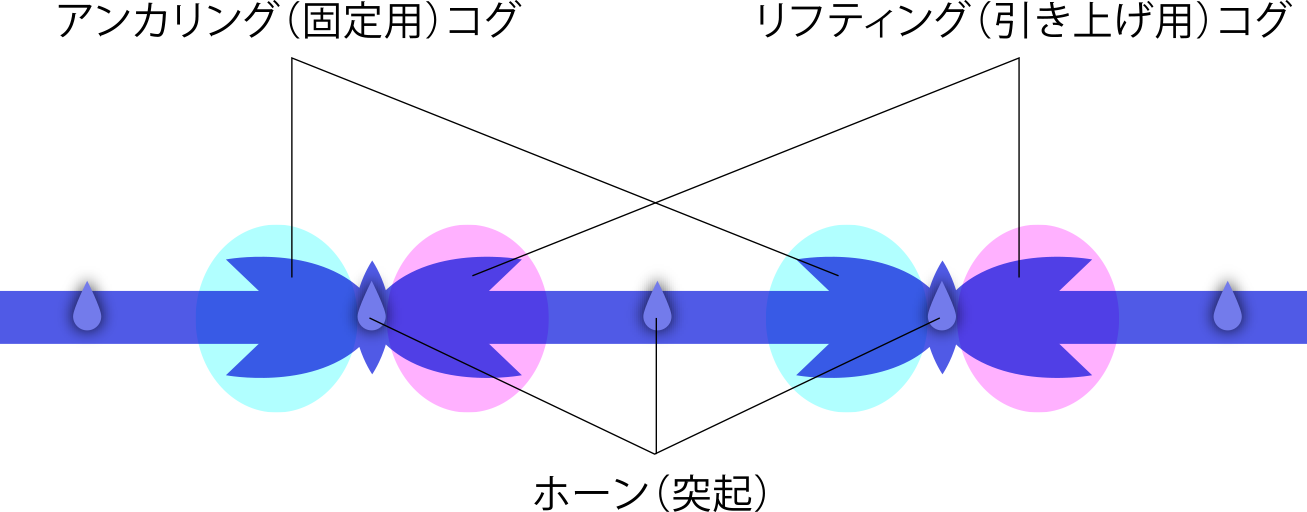 アンカープラスは、2つの連続したコグと、コグとコグの間にある小さなトゲがあることが特徴の糸です。