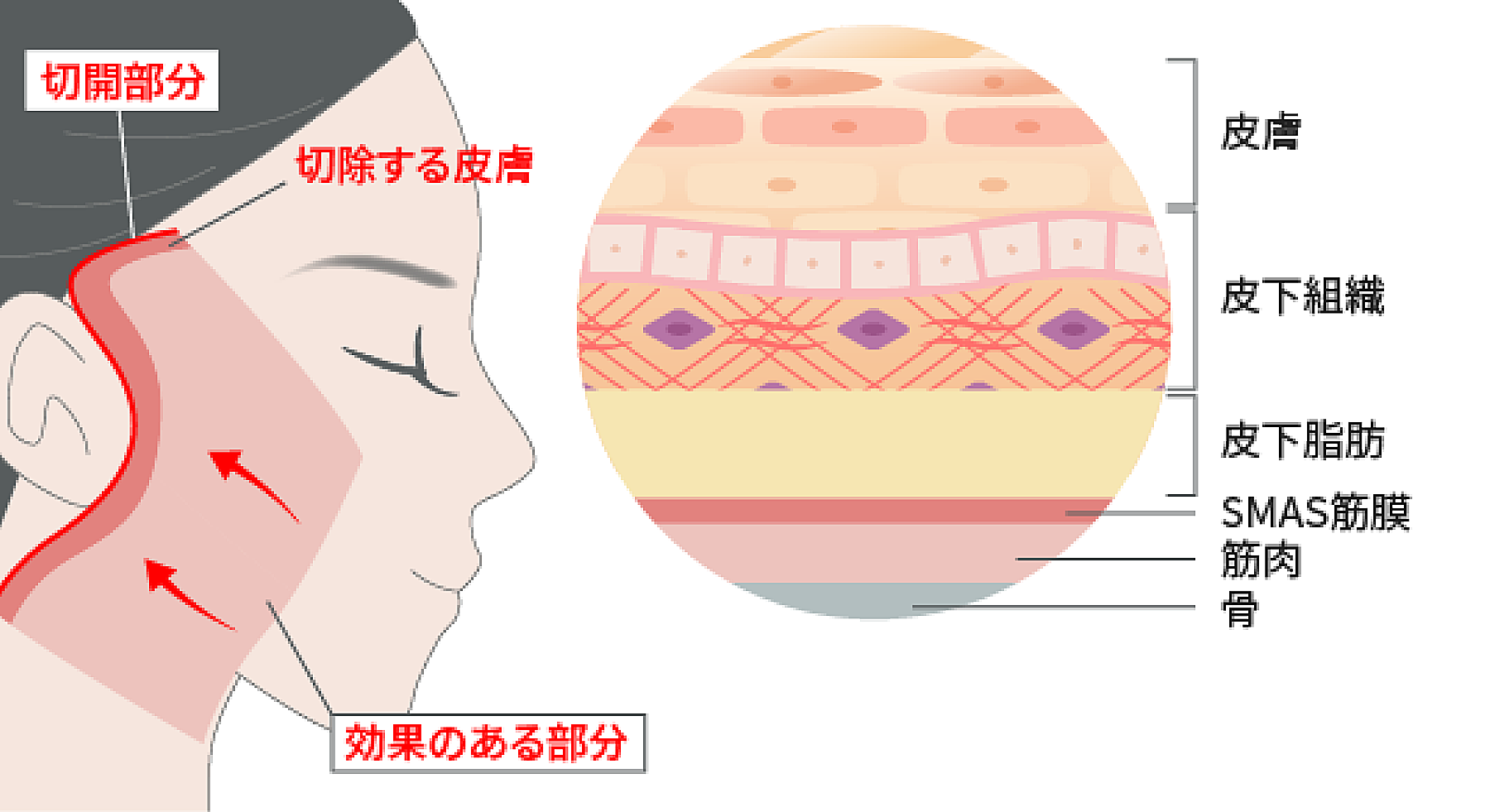 皮膚やSMASを切開部分に向けて引き上げ再配置し引き上げによって余った皮膚を切除