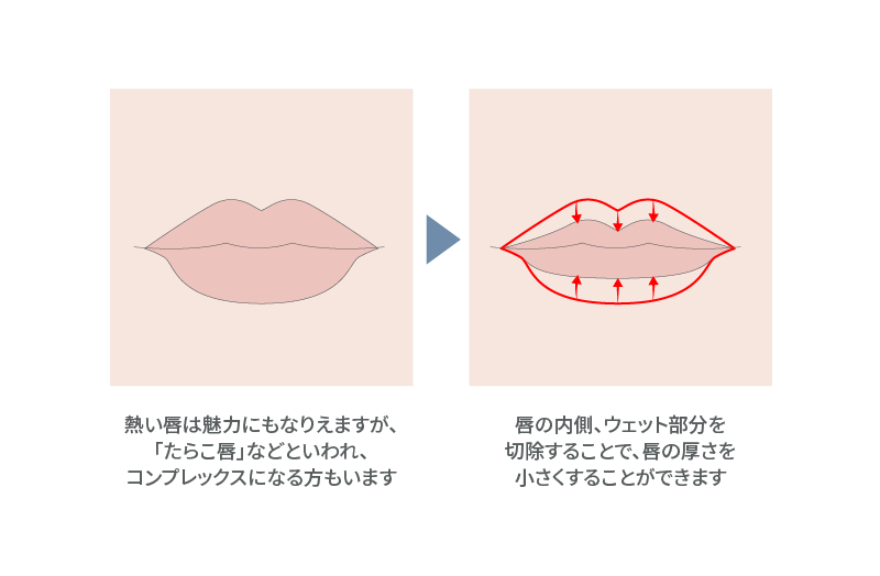 施術は主に上唇・下唇の内側を切開し、余分な粘膜や脂肪を除去して縫合します。局所麻酔で行われることが一般的で、比較的短時間で終わる手術です。